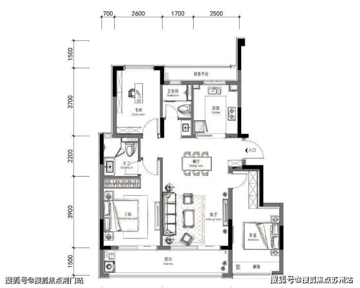 建面约106㎡三房两厅两卫户型,空间利用率高,整个户型鲜少有过道造成的空间浪费。